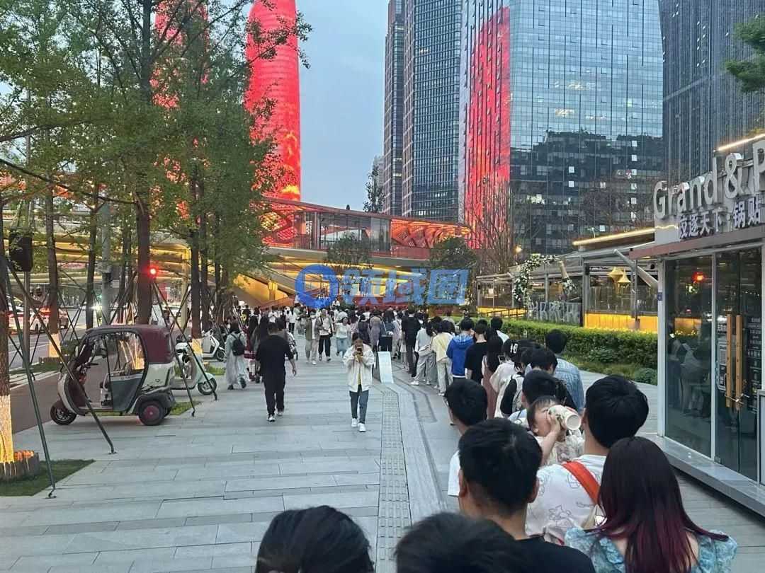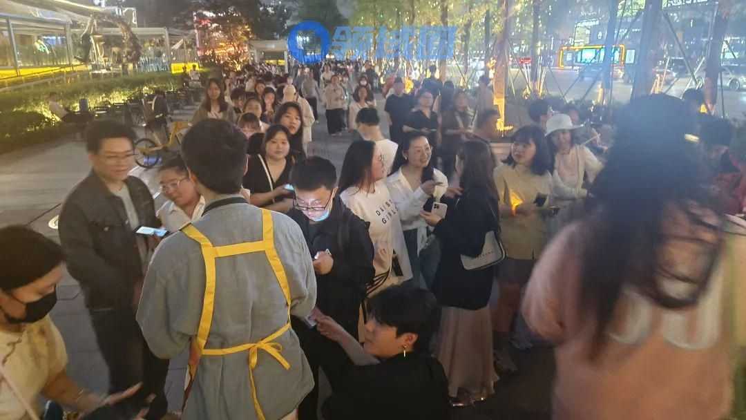 抵达双子塔时,正是晚上七点,活动入口前已经排起了一望无际的长队,蜿蜿蜒蜒绕过了一个路口,粗略估计一下有200多米。我顺着队伍向前走了许久,队伍中大多是青年男女,有些妆容精致,COS成自己喜欢的角色;还有些玩家脸上的“班味儿”尚未散去,一看就是刚下班就立刻赶来;我甚至还看到了一名身着全套骑行服的小哥在推着公路车排队。