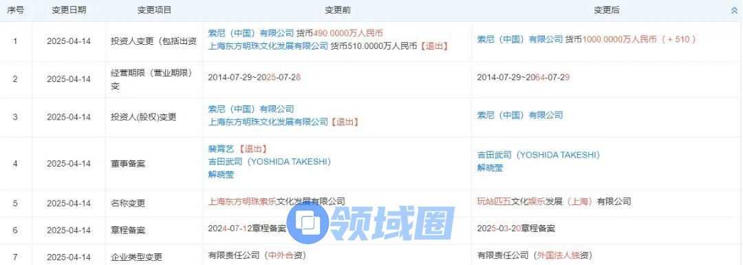 根据天眼查信息显示,近日原上海东方明珠索乐文化发展有限公司完成工商变更,正式更名为“玩站匹五文化娱乐发展(上海)有限公司”,原股东上海明珠文化发展有限公司全面退出,索尼中国持股比例从49%增至100%,完成全资收购。此次交易也标志着索尼在华的游戏机业务从合资模式转向独立运营,进一步深化了本土化的战略。