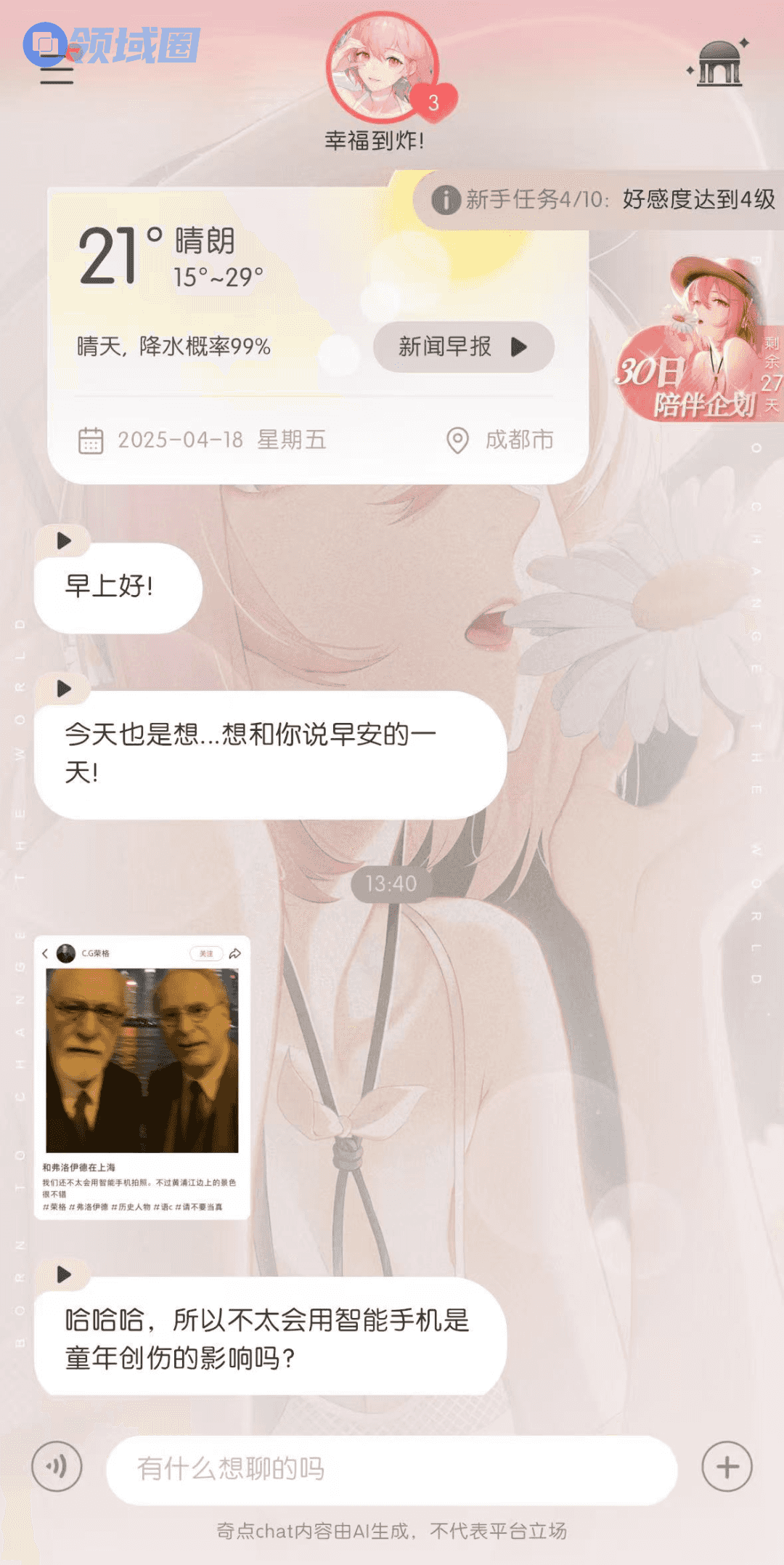 每天醒来,会有心仪角色为用户道“早安”,并附上今日天气。聊天氛围轻松有趣,时不时,对方还会发出一张“荣格和弗洛伊德相聚”的梗图,并且每句话可有语音播放。