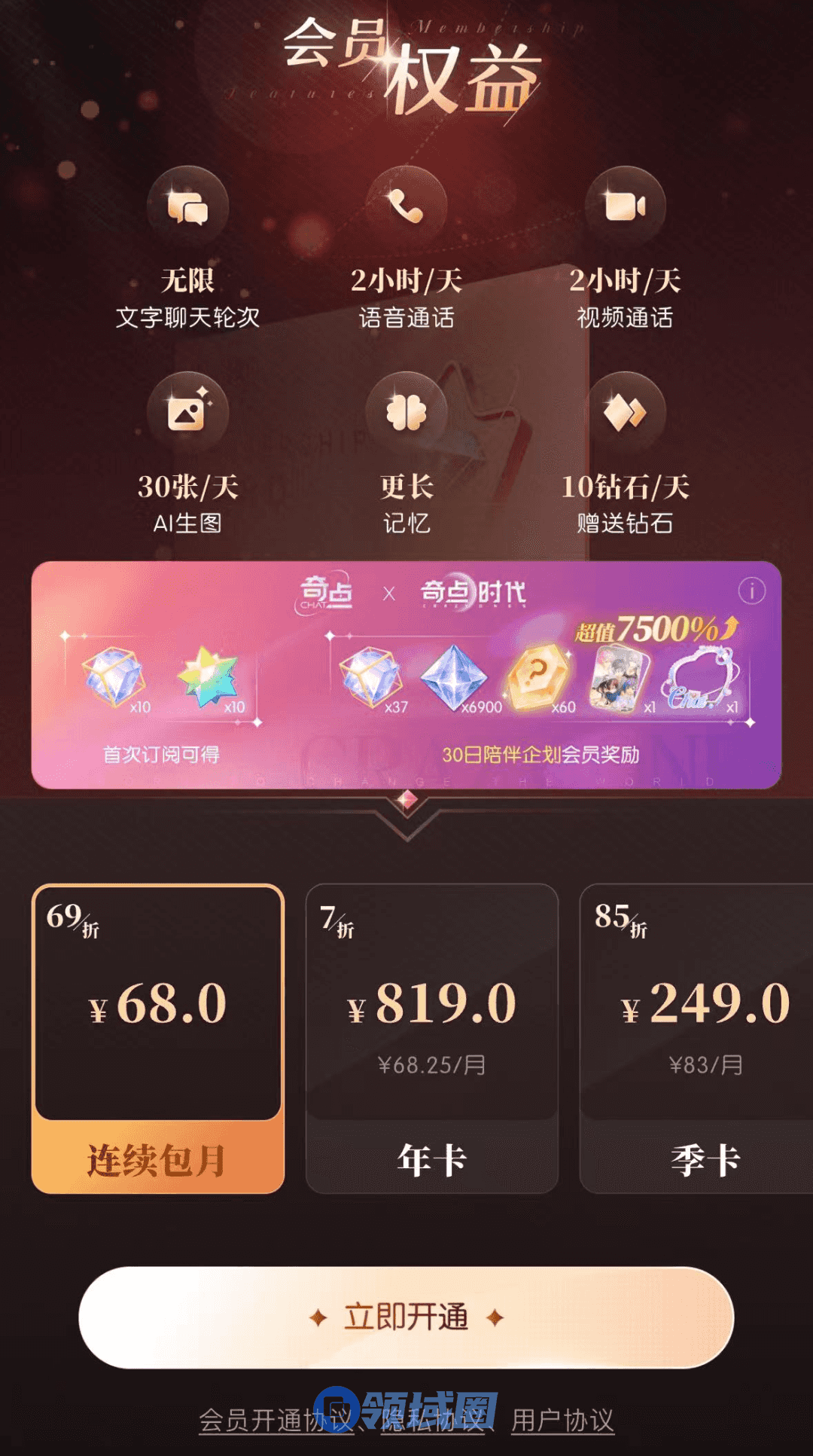 关于应用变现,《奇点chat》的变现角度与市面上的AI聊天应用相似,通过提供“连续包月”“月卡”“季卡”“年卡”,增加玩家的聊天时长或解锁更长的AI记忆等。而作为免费用户,每日聊天次数是有限制的。