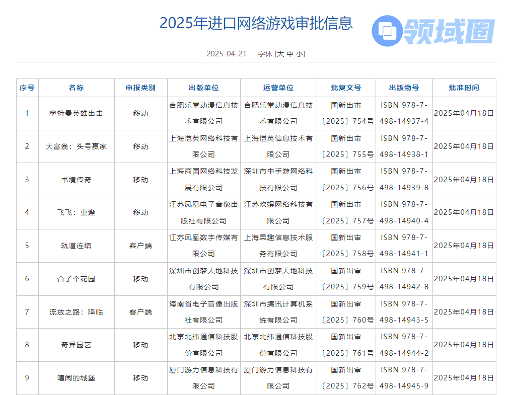 今日,2025年4月版号过审名单发布,共118款国产产品过审,9款进口游戏。