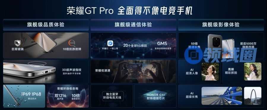 为打造一款全面领先的电竞性能旗舰,在可靠性上,荣耀GT Pro全系搭载了旗舰同款的荣耀巨犀玻璃,实现10倍抗跌耐摔,并且通过了SGS的五星认证;同时支持IP68&IP69防水防尘,可靠性全面进阶;更有旗舰同款的3D超声波指纹,干手、湿手、油手全秒解,响应迅速。