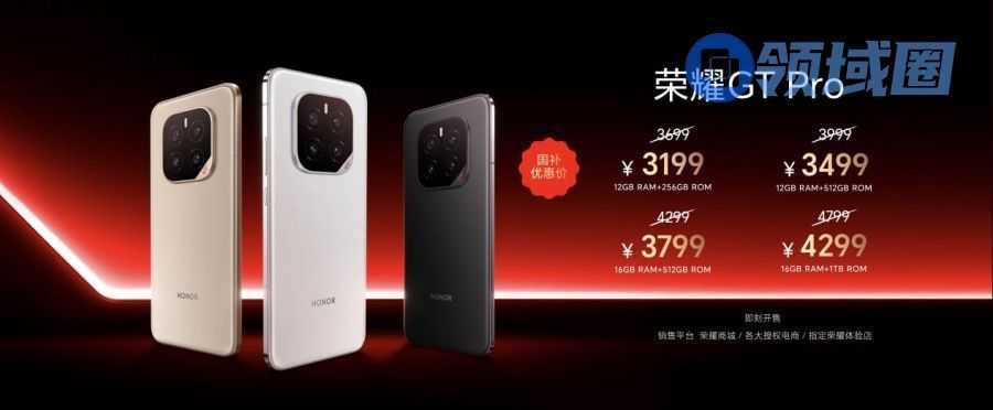 荣耀GT Pro延续了GT家族化镜头模组切角轮廓的deco设计语言,与极具跃动感的红色“GT”图腾相结合,拥有“冰晶白”、“幻影黑”、“燃速金”三款配色,提供12GB+256GB、12GB+512GB、16GB+512GB、16GB+1TB四个容量版本,国补后售价分别为3199元、3499元、3799元、4299元。