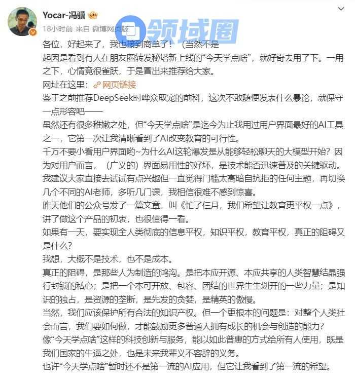 昨(22)天,《黑神话:悟空》制作人冯骥在个人微博上,向公众推荐了一款名为 “秘塔” 的 AI 应用。他在微博中指出,秘塔 AI 新上线的 “今天学点啥” 功能,以简洁的技术形态实现了知识传播层面的平权价值。