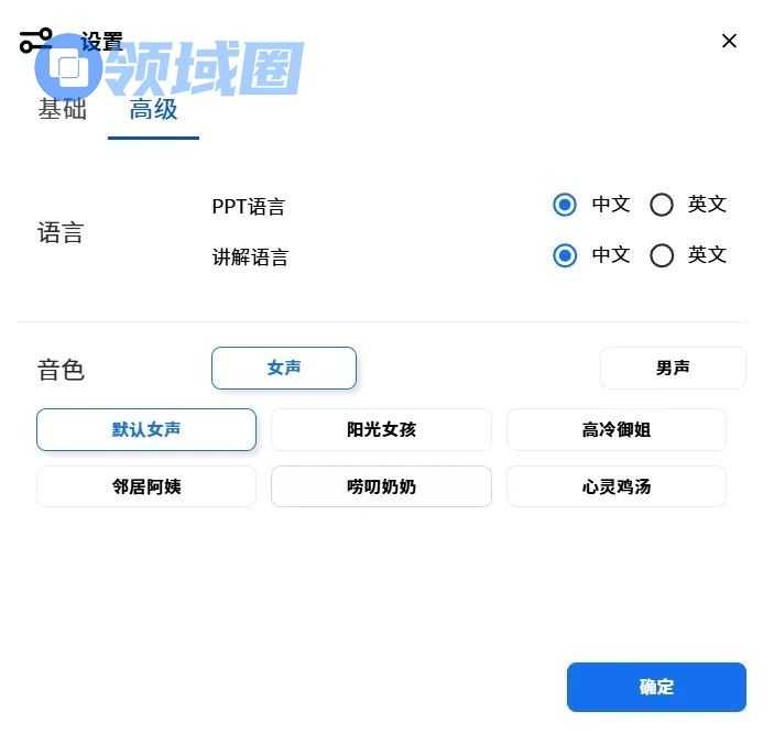 在高级设置里,有中英文两种语言可供切换,也能选择各类音色。