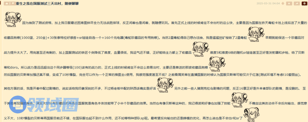 不过,就“前哨测试”本身的质量和今天官方蓝帖的内容出发,玩家的风评并没有如我想象的那般负面,各大社区,认可国服测试期间优化、对正式公测表达期待、赞许福利力度的声音不在少数。