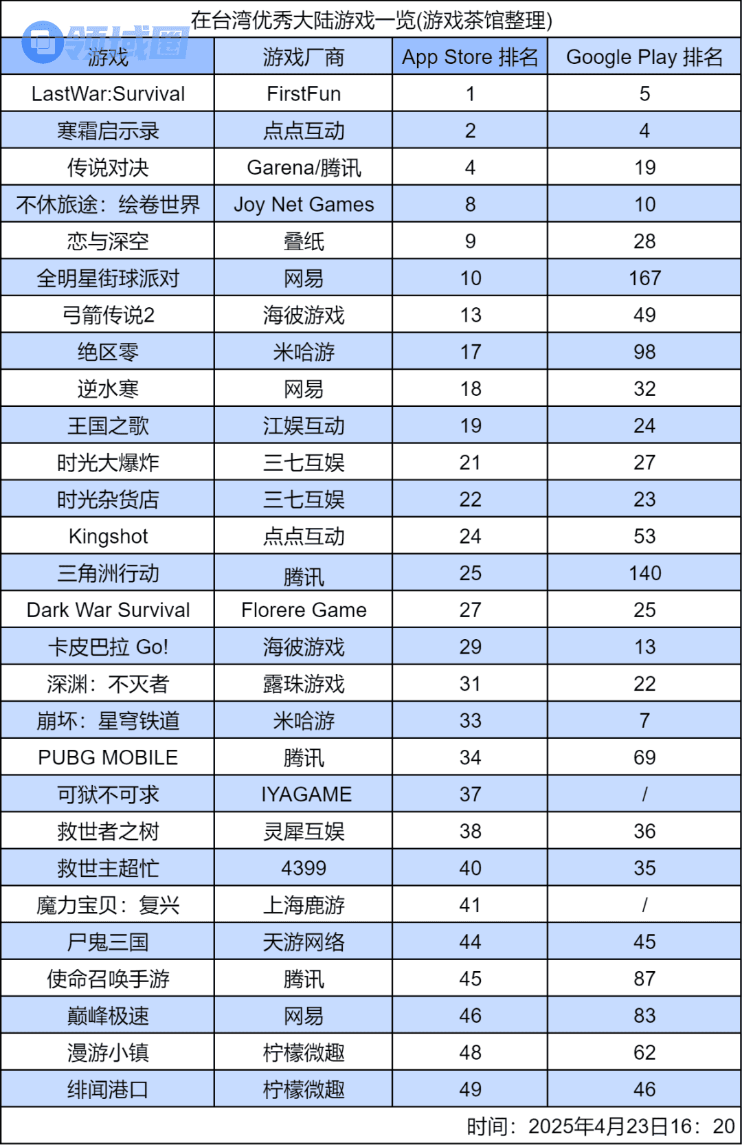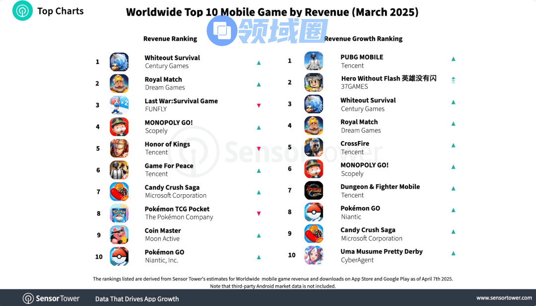 《LastWar:Survival》是由Firstfun在2023年底发行的休闲SLG,它和点点互动旗下的《Whiteout Survival》已成为出海双杰,共同占据各国畅销榜前列。而据Sensor Tower,在3月,凭借2周年庆典及“Dawn Feast 黎明盛宴”活动,《Whiteout Survival》也首度登顶全球手游收入榜。发行商点点互动也超越网易,成为中国手游发行商收入榜第2名。