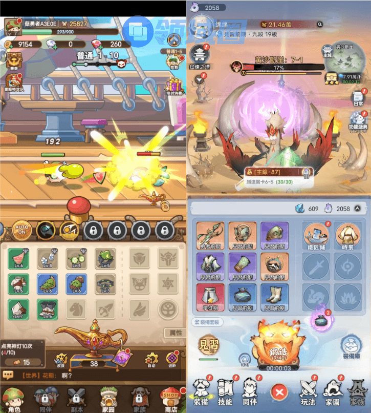 之所以说《不休旅途》是“菇勇者like”,是因为两者在玩法系统上很相似。首先,从整体来看,它们都分为放置养成、实时战斗和MMO组队玩法。比如在养成方面,两者角色培养逻辑相似,玩家投喂材料(擦亮神灯)随机刷取装备,再通过抽取技能,从而提升角色能力、推进主线。