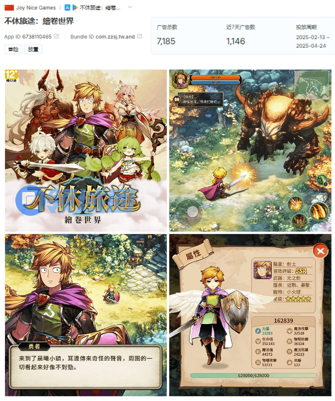 并且从投放上来看,据AppGrowing国际版,《不休旅途》从上线前一个月开始投放,直至上线后,每日素材投放总量超过1000。截至4月2日,他的广告素材总量为7185条。相关投放素材内容除以“大世界RPG”、“放置”和“福利”作为关键词,还着重渲染游戏开局难度,用来吸引玩家。