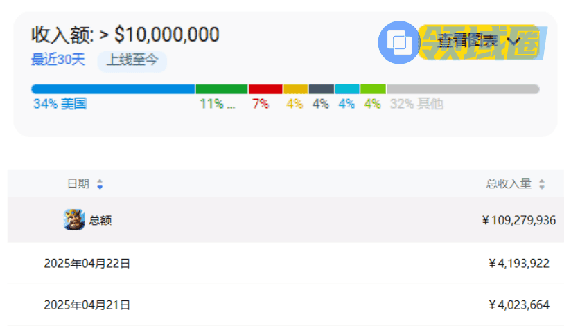 2月末,登录海外后,《kingshot》便在台湾地区游戏畅销榜便逐渐爬升,最高来到第22名,并有持续提升的趋势。点点数据显示,截至4月22日,上线两月,《kingshot》累计流水为1.09亿元。其中,台湾地区玩家为《kingshot》贡献了7%的收入,排名第三,最高贡献地区为美国(34%),其次是韩国(11%)。