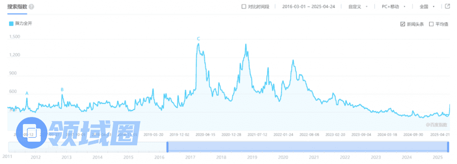 百度搜索指数显示,“舞力全开”在国内的网络热度从2019年后开始迅速爬升