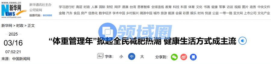 2024年,国家卫生健康委员会等16个部分联合启动为期三年的“体重管理年”活动,今年年初还发布了《2025年全民健康体重管理行动计划》,明确提出将体重管理作为年度重点健康工作之一,目的在于提升全民体重管理意识与技能,普及健康生活方式。