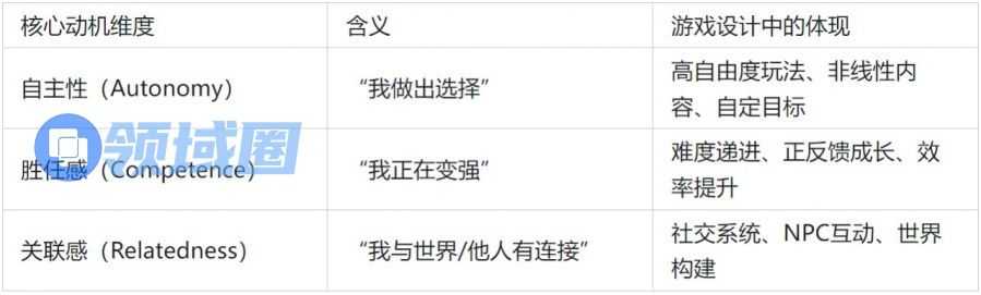 玩家产生长期、稳定、积极的内在动机,需要满足三大心理需求——