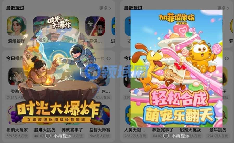 其三,玩家进入小游戏中心页面后,会弹出广告窗口,短短数天内,GameRes先后经历了《加菲猫家族》、《时光大爆炸》、《向僵尸开炮》等游戏的广告,大致可认为厂商在首发大推或游戏版本更新的时候会选择该项服务,其目标受众其实框定在特定范围内,即愿意主动搜寻游戏的用户。