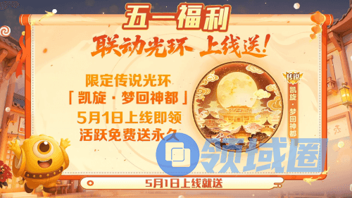 五一期间登录游戏,即可获得国风重铸版经典凯旋光环“凯旋·梦回神都”,以盛唐神都为灵感,将千年宫阙的恢弘与孔明灯的浪漫流光凝练于光环之中。金线勾勒的飞檐斗拱、琉璃溢彩的灯火轨迹,每一步移动皆如盛世画卷徐徐展开。