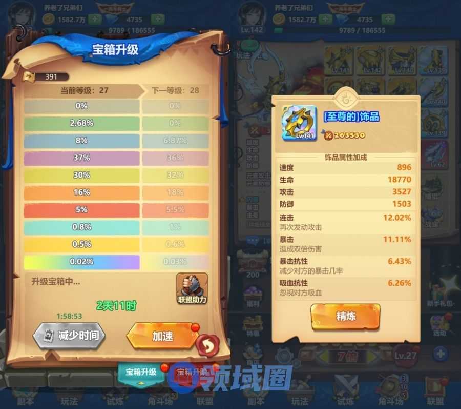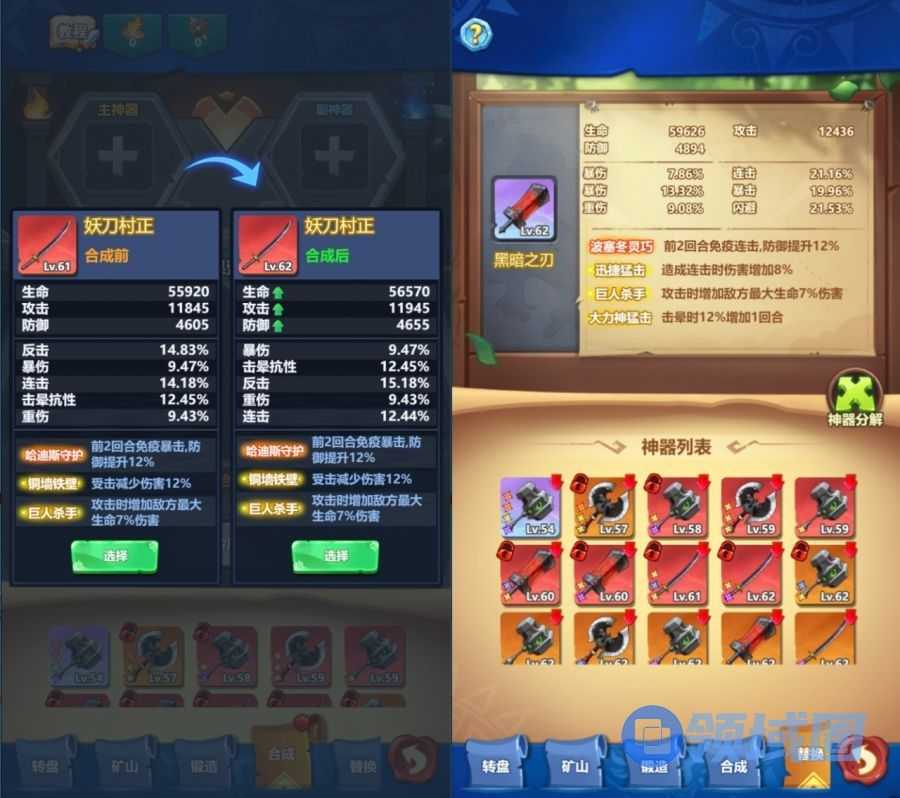 等到了50级开放神器系统后,面板的特殊属性将得到进一步提升。神器系统和装备相似,通过消耗材料锻造获得具有三维、属性以及特殊效果词条的神器,比如说增加连击伤害的黄色词条,前两回合免疫击晕、闪避、连击、反击等效果的红色词条。与装备不同的是,神器的养成维度更深,21天后将开放神器合成功能,可以将两个武器的属性和词条合成在一起,甚至有概率能提高神器的品质。