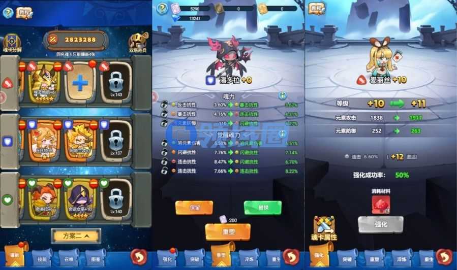 拿魂卡来说,魂卡分为攻击、防御、生命三个模块,随着等级的提升会开放槽位,可以装置更多魂卡。每张魂卡都拥有独特的技能效果,可以进行强化和升星(强化有概率失败),强化达到一定等级能够解锁更多属性条数,属性可以通过洗练来改变。