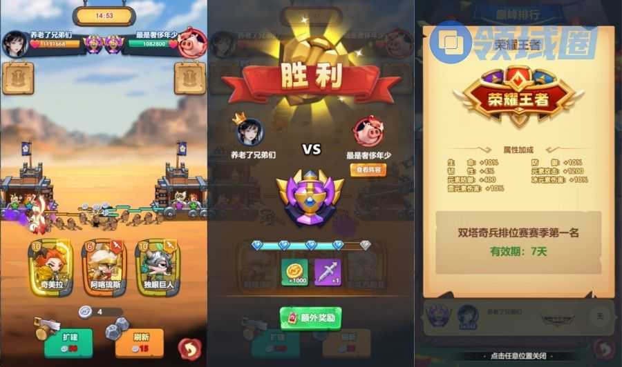 其一是周期轮换玩法,增加可玩性。游戏以周为单位,三周一个循环,轮换「海岛争霸」、「三军争战」、「永恒战场」&「天下第一」三个活动,前二者为团队合作活动,后者为个人竞技活动。