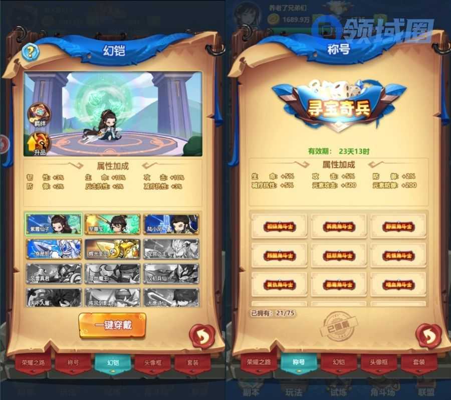 IAP的付费设计主要集中在养成和体验升级上,养成的商业化的最终导向目的都是数值提升,就算是幻铠、称号、头像框等外观奖励也均与数值挂钩,能够带来属性和三维的直接提升。
