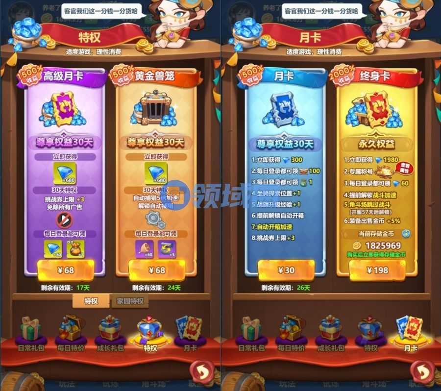 体验升级则是放在一些自动化功能上,比如说在玩家形成自动开箱依赖后,在农场的自动捕猎上设计了付费点;在免广告功能做成了月卡形式;将角斗场的战斗跳过功能放到了永久月卡中等等。