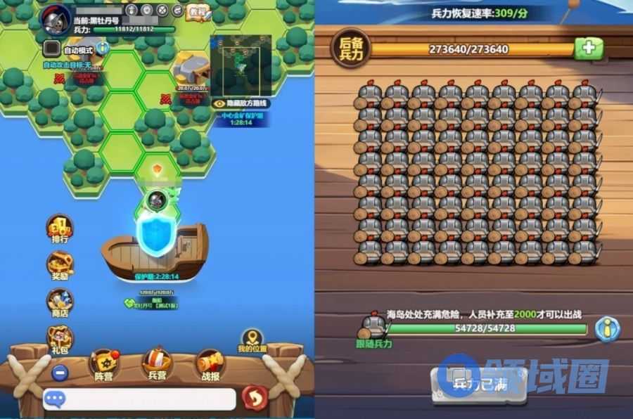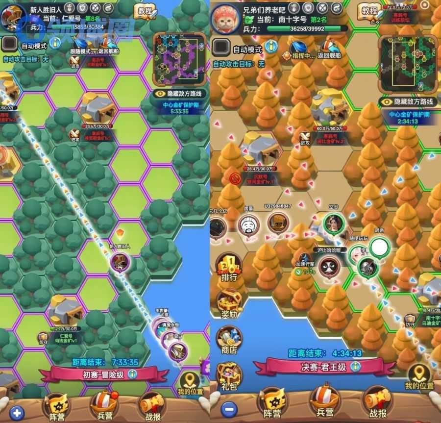 以「海岛争霸」为例,这是融合了slg玩法的活动模式,活动持续3天,以区服为单位,两个区服匹配在同一阵营,和其他七个阵营的玩家进行对抗。所有玩家的战力将换算成初始兵力,战力只决定初始兵力、兵力上限和兵力恢复速度,对战局影响并不起决定性作用。换句话说,这是一个靠团队协作和战术策略获胜的一个活动,即便是有氪度的玩家,在其中也需要和队友进行配合攻防。