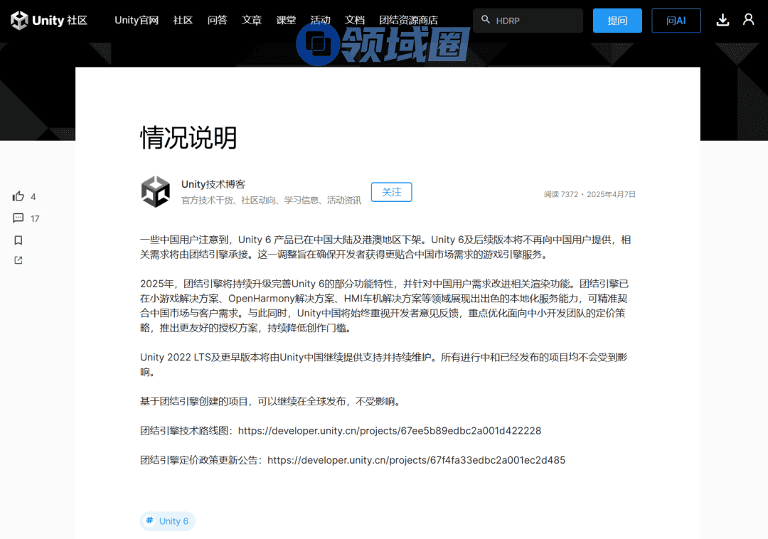 值得一提的是,在今年4月初,Unity官方发布公告,表示“一些中国用户注意到,Unity6已在中国大陆及港澳地区下架。Unity 6及后续版本将不再向中国用户提供,相关需求将由团结引擎承接,这一调整旨在确保开发者获得更贴合中国市场需要的游戏引擎服务”。