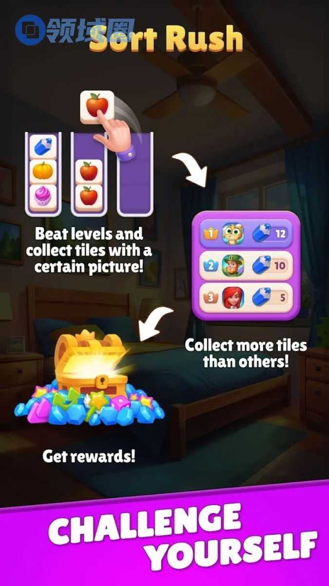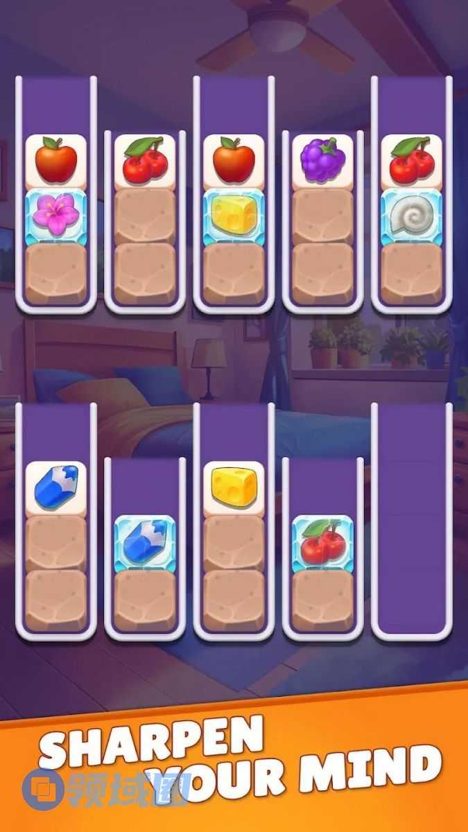 介绍:挺新奇的水排序+TileMatch表现的组合形式,把水替换成了Tile的瓷砖,关卡的曲线也比水排序难了很多,前几关就引入了很多棋盘元素和新机制,关卡陡峭,看了一下公司过往也做过TileMatch、Match3、Word等各种益智游戏,应该也是迭代进化而来的思路。