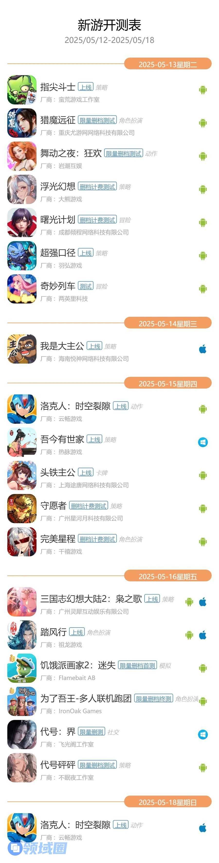 GameRes游资网统计了2025年5月12日—2025年5月18日的最新手游开测信息,共有19款游戏开测。以下是开测信息: