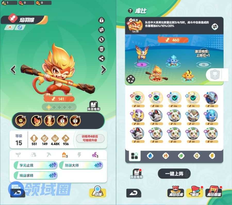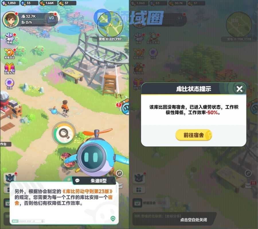 对于小游戏的用户群体而言,《曙光重临》如果单纯复刻《幻兽帕鲁》的玩法设计,难免会显得框架太过冗长,理解门槛高,不利于过程体验,因此游戏加入了养成放大宠物能力,帮助玩家更直观地感受库比属性和能力的提升。