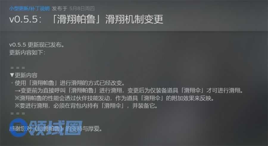 在此期间,《幻兽帕鲁》对核心玩法进行大幅调整,比如说在2024年11月30日的更新补丁中取消了通过“投掷帕鲁球”来召唤帕鲁的机制,改为在玩家身边直接静态召唤;游戏在近期的v0.5.5版本中再次对滑翔机制进行调整,改为使用独立道具“滑翔伞”进行空中移动,而非依靠帕鲁自身能力。