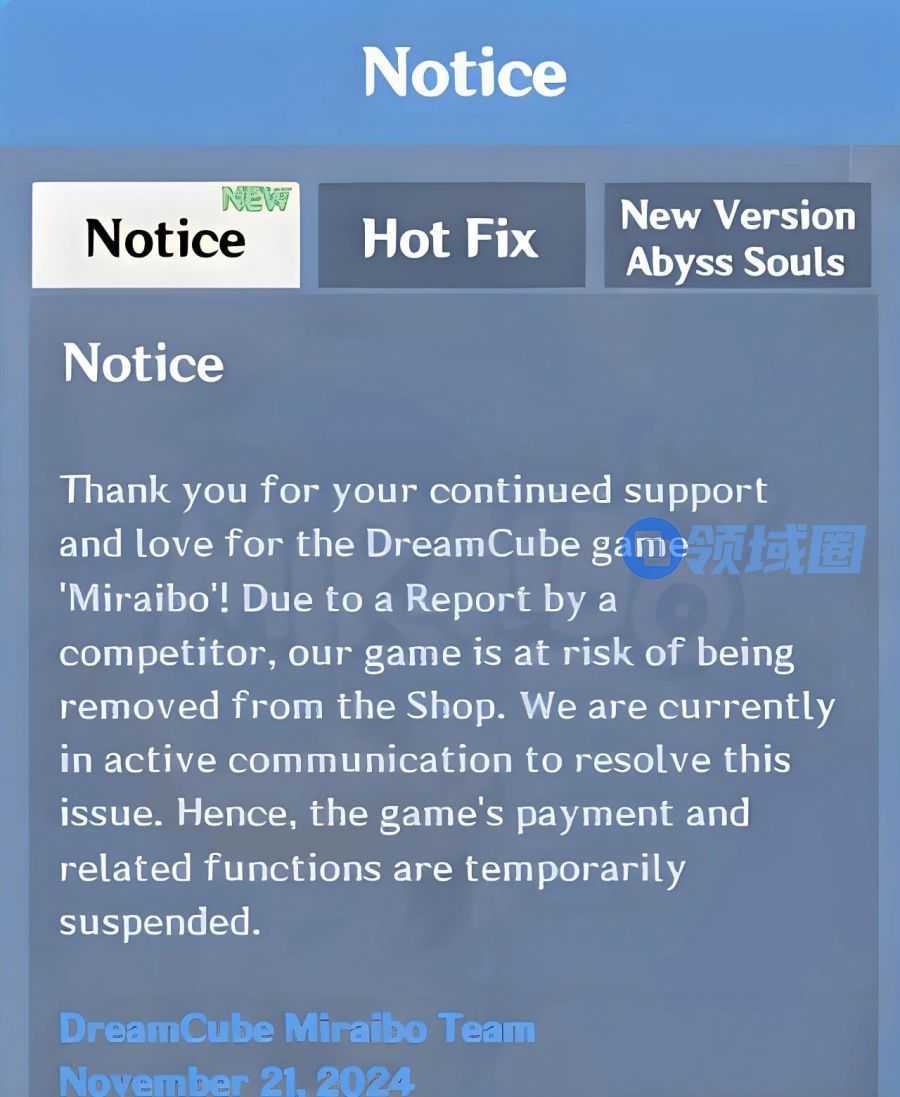 这也为后来的帕鲁like敲响了警钟:需要规避任天堂与宝可梦公司的专利内容,避免构成侵权行为。祖龙在海外上线的《Miraibo Go》在今年年初就因此被迫下架,据下架公告显示「因为一名竞争对手的报告,我们的游戏有被下架的风险」,服务器正式于2025年1月17日关闭。
