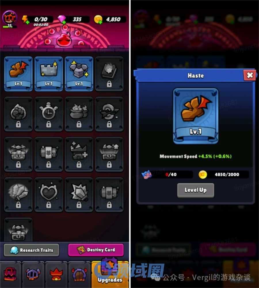 - 升阶消耗金币和恶魔碎片,提升品质,解锁更强力被动