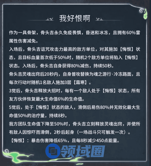 入场80%减伤+免疫控制,【悔恨】压暴伤和能量,3觉治疗转化、5觉滑倒易伤/禁疗攻防一体。50%血线复活+群体滑倒堪称翻盘神技,不过要小心真伤穿透,这时候靠队友护盾/治疗补漏~负面状态和水队控场体系绝配!