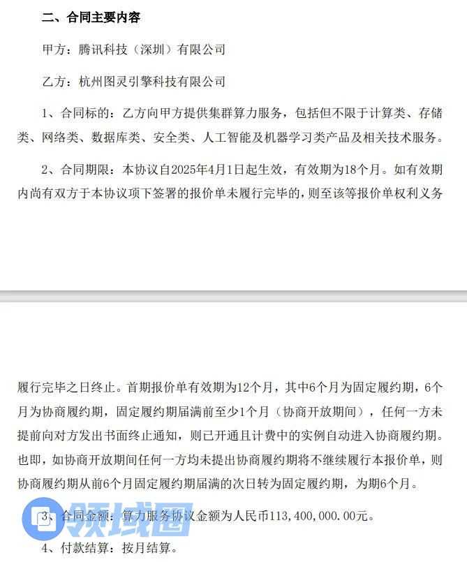 腾讯花费1.13亿元,向一家公司租赁算力。