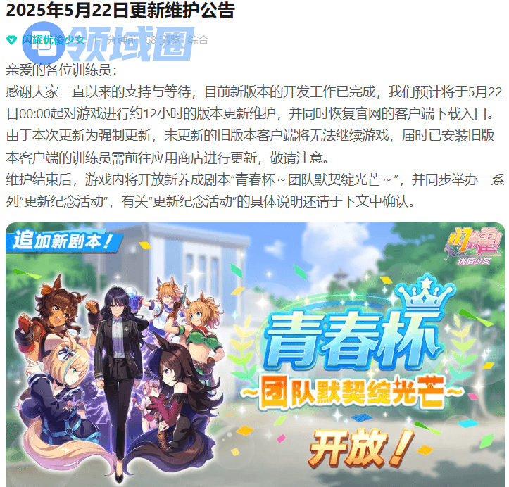 通过最新公告内容显示,经过这次“技术升级需要”,《闪耀!优俊少女》对“部分游戏内英文UI、角色立绘、场景模型等进行重新设计,并调整了部分比赛名称、NPC名称、道具名称等相关文案”。