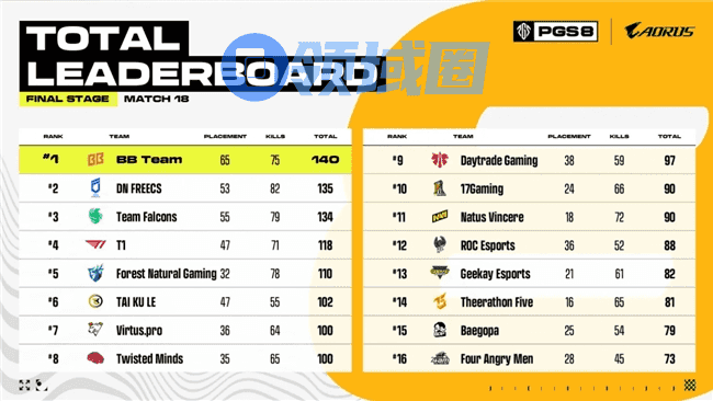 而BB战队在第四把和第五把中,也都冲进了前4。特别是第五把的对局,面对T1、NAVI和FOR的围攻,依然保持着冷静的运营策略,并在最后凭借一颗燃烧弹,成功双杀了T1战队,拿下胜利。