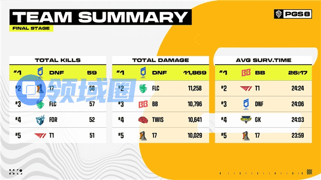 在第三日的最后一把比赛中,4AM整局稳扎稳打,步步为营。在最后一圈时,其与DNF上演了2V2的对决,凭借着一堵墙的掩护,满编的4AM不负所托淘汰了对面,同时也拿下本次PGS8赛事的最后一局。至此,PUBG PGS8总决赛落下帷幕,BB战队顺利夺冠,DNF和FLC分别位居第二和第三名。