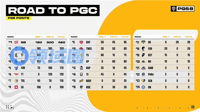 根据此前的规则,PGS7&8均采用了经典双阶段赛制,24支战队将分为三组(A/B/C组)进行为期三天的角逐,每天6场比赛,总积分前16名晋级决赛,末位8队淘汰。晋级的16强经过3天18场的鏖战后,积分榜榜首战队将加冕冠军。接下来,我们就一起来看看本次PGS8的精彩回顾吧。