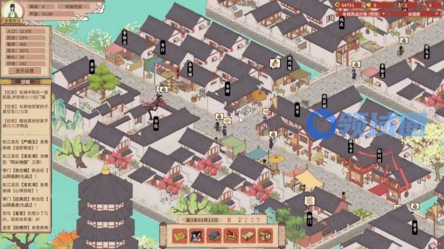 而较低的起点,较长的发展周期也为世族市井化与高自由度的需求创造条件,玩家要一步步从寒门升级到世族,就要在更复杂的市井与人物之中寻找各种不一样的机会。为此,游戏为玩家设置了一个少则几百多则数千建筑物的微观城市,城市内不仅有各种功能的设施,也有多达数百人的NPC角色坐落其中;玩家为了一步步向上爬,既要利用设施与路人获取打工与赚钱机会,例如利用自己的学问帮人抄书写字来赚取外快,同时在金钱的积累之中,也可以进一步收购城市的房屋与土地,进而经营商铺与出租住宅,扩大资本规模。