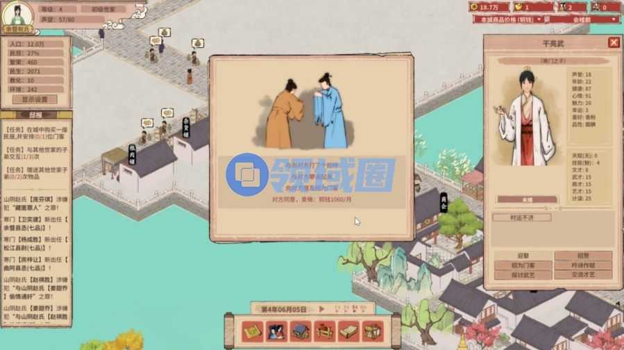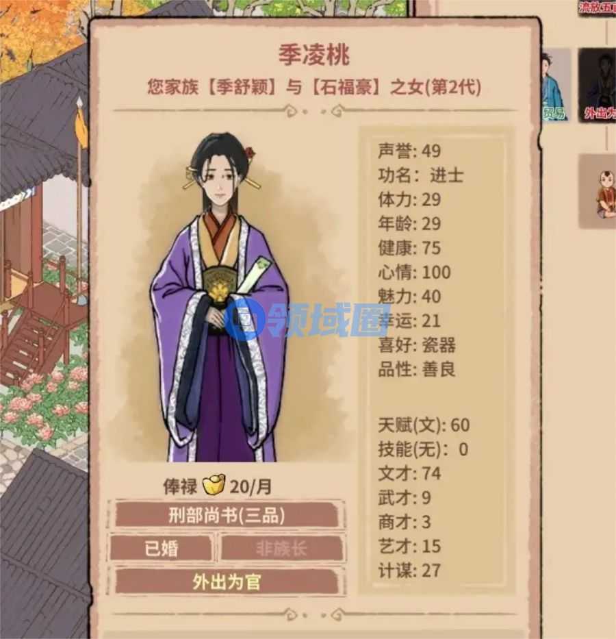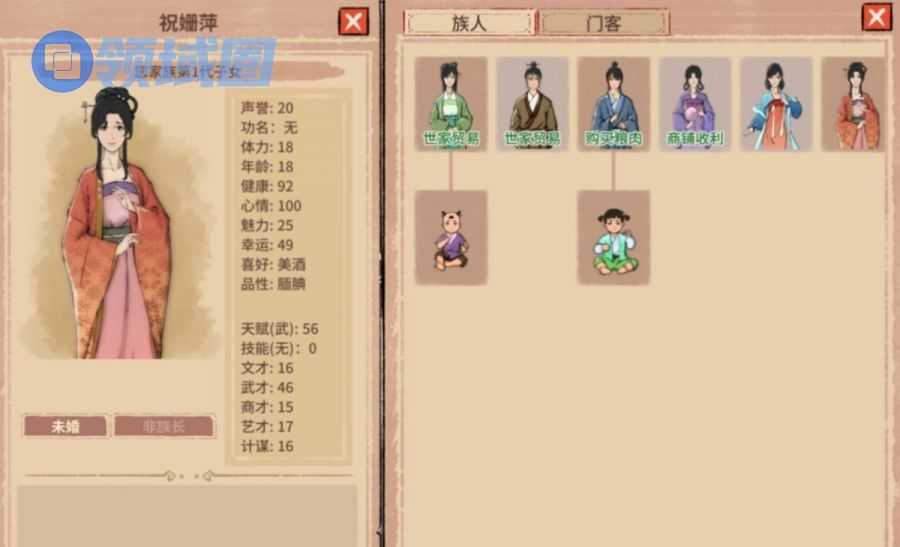 此外, 每个具体的世家子弟,玩家还得根据其能力与特点进行培养,擅长文才的考取功名,擅长商才的为玩家经营商铺其与他家族的买卖;擅长艺才的,长相出众的族人可以帮忙结交雅士,扩大家族的名望与人情范围。