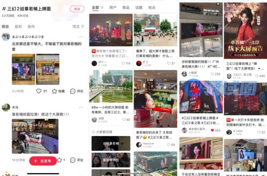大手笔投放的线下广告更是成了一道靓丽的风景线,官方在北京、广州等地的标志性大厦及人流聚集的商场投放大屏广告,吸引海量路人及粉丝拍照、打卡,不少人惊呼“大屏与章若楠的美貌相得益彰”,纷纷表示:《三幻2》这波,太有排面!
