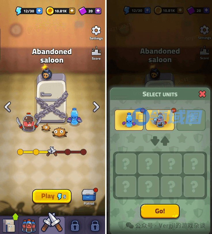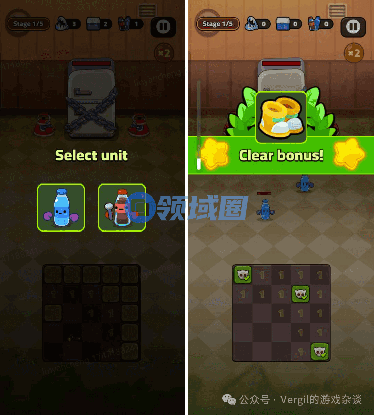产品目前开测不久,主要测试美术风格和核心玩法:美术采用2D卡通风格,以厨房家具为主题,玩家操控各种瓶子,来抵抗病毒对冰箱的入侵;核心玩法为放置塔防,在备战阶段通过扫雷玩法,获取更多瓶子或BUFF来强化队伍,是比较新鲜的融合方式;外围结构较为简洁,目前也没开放付费功能。
