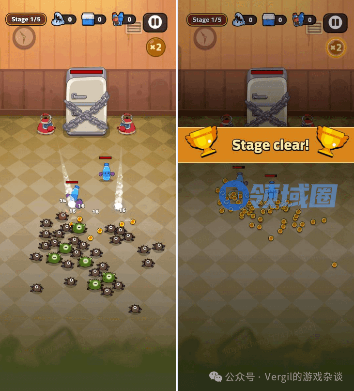- 简约的美术设计:美术选型为2D卡通风格,玩家指挥饮料瓶子,在厨房抵御病毒的入侵,虽然美术风格一般,但题材比较接地气