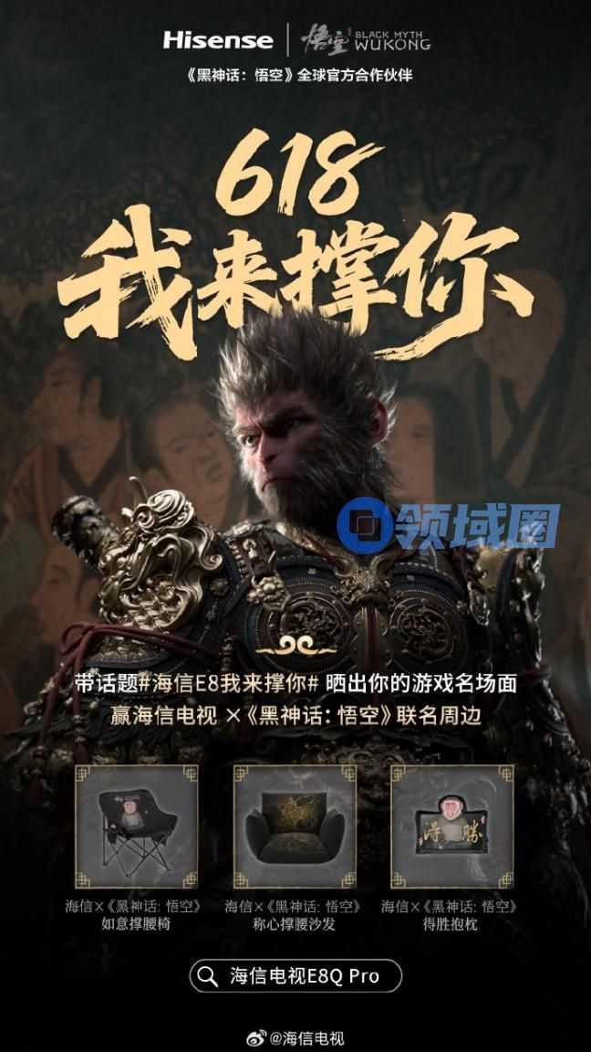 不仅如此,作为《黑神话:悟空》官方合作伙伴,海信电视还为天命人们准备了更多惊喜,5月28日-5月30日,购海信电视指定型号送海信x《黑神话:悟空》联名周边,活动详情如下: