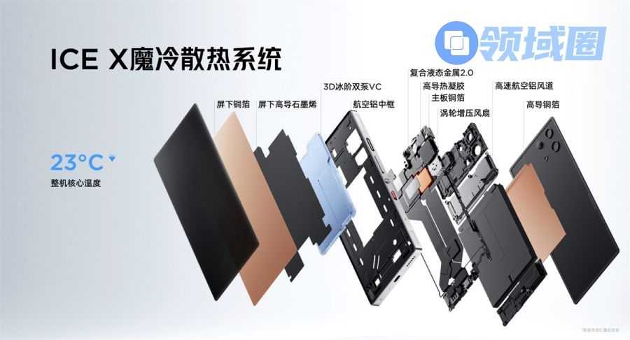 在狂暴性能稳定输出的背后,都离不开强劲散热系统的支撑。红魔10S Pro系列搭载了行业领先的ICE魔冷散热系统,采用液态金属2.0+风冷散热的组合方式,将液态金属直接贴合在CPU 热源上方,导热效率较前代提升250%,液态金属导热面积提升30%,配合高导热合金材质保障安全性,使CPU核心温度再降5℃,为强悍性能输出提供坚实保障,再次定义了电竞旗舰的散热标杆。