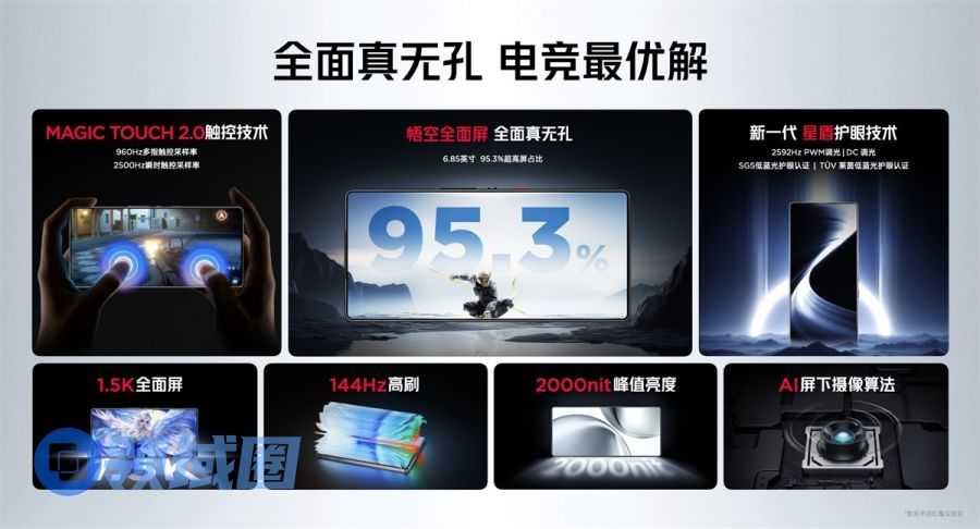 作为屏下技术的领航者,红魔在屏下技术上已经迭代到第七代。红魔10S Pro系列搭配6.85英寸、屏占比高达95.3%的悟空全面屏,做到全面真无孔,带给用户极具冲击的视觉体验。屏幕的1.5K分辨率、2000nit峰值亮度与144Hz自适应高刷组成视效黄金三角。极窄1.25mm黑边让游戏体验更胜一筹。