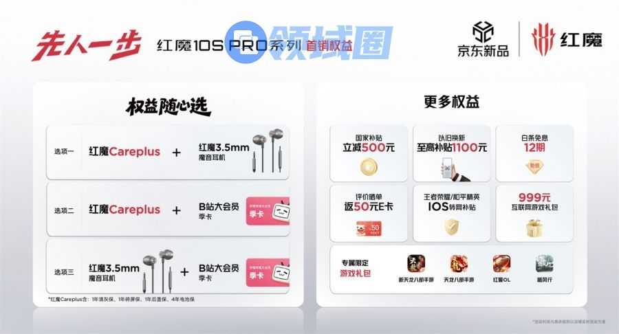 5月26日,红魔10S Pro系列在京东开启全球首发!现推出全球独家“先人一步新品尝鲜购”活动,上京东搜索红魔10S Pro,即可抢先体验新机。不仅如此,红魔10S Pro系列还带来了多重惊喜权益:首销用户下单即享权益随心三选一、至高享白条12期分期,以旧换新至高补贴1100元。此外,购买红魔10S Pro系列,还能解锁游戏世界福利,《新天龙八部手游》、《天龙八部手游》、《踏风行》、《红警OL》等热门游戏的精美道具免费送,助你畅玩无阻!