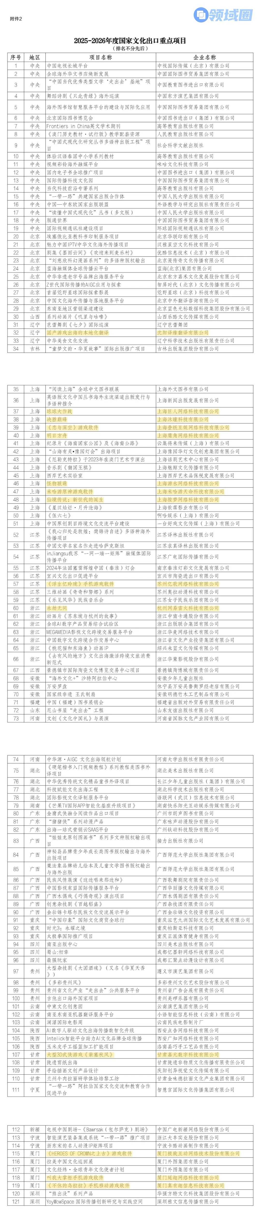 5月26日,中华人民共和国商务部服务贸易和商贸服务业司公布了2025—2026年度国家文化出口重点企业和2025—2026年度国家文化出口重点项目名单。该名单由商务部、中央宣传部、文化和旅游部、广电总局共同认定。
