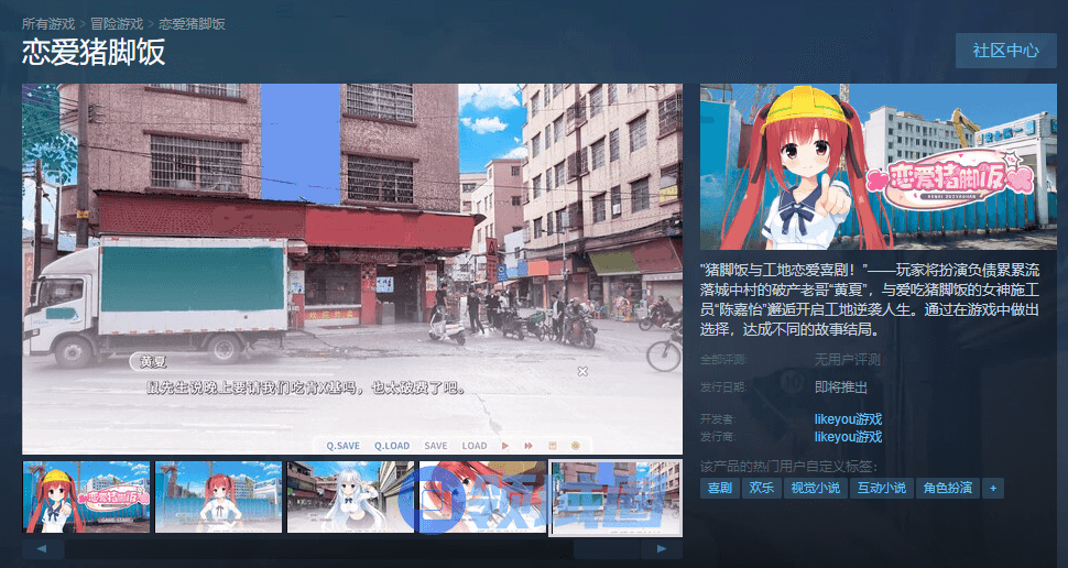 《恋爱猪脚饭》是由国内独立团队“likeyou游戏”开发的一款“工地逆袭恋爱喜剧”。玩家扮演负债累累的土木老哥“黄夏”,在城中村邂逅爱吃猪脚饭的工地女神“陈嘉怡”,展开励志与浪漫交织的故事。