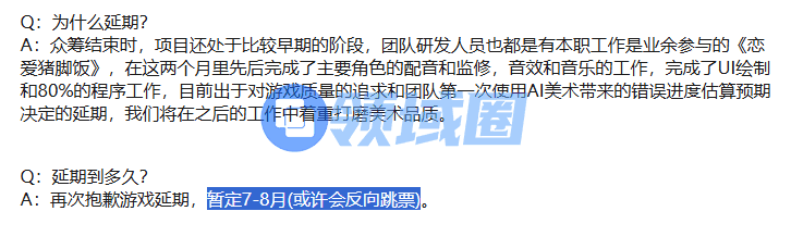 而项目进度滞后则是因为团队“首次使用AI美术导致进度误判”,目前已经完成80%程序工作,但游戏美术品质仍需打磨。因此游戏将被延期至7-8月发售,还承诺将为众筹玩家追加赠品徽章,并免费提供未来的DLC。